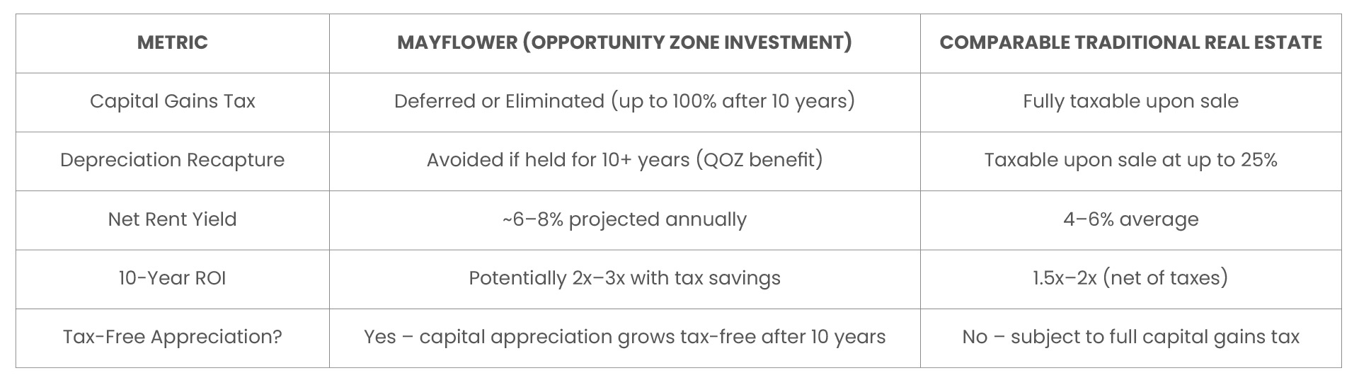 Mayflower offers investors powerful financial advantages through the Qualified Opportunity Zone (QOZ) program. Capital gains can be deferred, appreciation grows tax-free, and depreciation recapture is eliminated after 10 years.